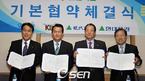 한국시리즈 4차전이 열리는 26일 잠실야구장 소회의실에서 김지완 현대증권 대표이사, 박주원 안산시장, 신상우 KBO 총재,이종수 현대건설 대표이사(왼쪽부터)가 '안산 문화복합돔구장 건립사업 협약체결식'을 가졌다. 네 사람이 협약서에 사인한 뒤 들어보이고 있다./잠실=손용호 기자spjj@osen.co.kr <2007 삼성 PAVV...