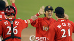 2007 프로야구 두산 베어스와 SK 와이번스의 한국시리즈 5차전 경기가 27일 잠실야구장에서 벌어져 8회초 고영민의 악송구 생긴 찬스에서 4득점한 SK가 두산을 4-0으로 물리치고 한국시리즈 우승에 1경기를 남겨 놓았다. 정대현이 9회말 1사 1루서 홍성흔을 병살로 처리, 경기를 끝낸 후 동료들과 하이파이브를 나누고 있다./잠실=손용호...
