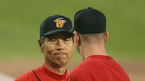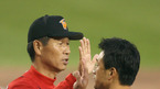 2007 프로야구 두산 베어스와 SK 와이번스의 한국시리즈 5차전 경기가 27일 잠실야구장에서 벌어져 8회초 고영민의 악송구 생긴 찬스에서 4득점한 SK가 두산을 4-0으로 물리치고 한국시리즈 우승에 1경기를 남겨 놓았다. 6이닝 무실점으로 호투, 승리의 디딤돌을 놓은 레이번을 김성근 감독이 반갑게 맞이하고 있다./잠실=손용호...