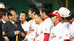 2007 한국시리즈 우승컵은 SK 와이번스의 품에 안겼다. SK는 29일 인천 문학야구장에서 벌어진 6차전에서 두산에 3-1로 승리, 2패 뒤에 4연승을 하는 대역전극으로 한국시리즈 우승을 차지했다. 신상우 한국야구위원회 총재가 우승을 차지한 SK 선수단에게 우승 메달을 걸어주고 있다./인천=김영민 기자ajyoung@osen.co.kr <2007...