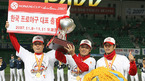 2007 한국시리즈 우승컵은 SK 와이번스의 품에 안겼다. SK는 29일 인천 문학야구장에서 벌어진 6차전에서 두산에 5-2로 승리, 2패 뒤 4연승을 하는 대역전극으로 창단 후 첫 한국시리즈 우승을 차지했다. 두산 주장 홍성흔이 정원석과 함께 준우승 트로피를 들어보이고 있다./인천=손용호 기자spjj@osen.co.kr <2007 삼성 PAVV...
