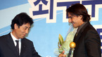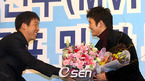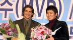 '2007 삼성 PAVV 프로야구 최우수선수(MVP)/최우수신인선수 투표 및 각 부문별 시상식'이 31일 롯데호텔 크리스탈볼룸에서 열렸다. 22승을 거둔 리오스가 압도적인 표차로 MVP에 선정됐다. 김승영 두산 단장이 리오스에게 꽃다발을 건네고 트로피를 쳐다보고 있다./손용호 기자spjj@osen.co.kr <2007 삼성 PAVV...