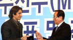 '2007 삼성 PAVV 프로야구 최우수선수(MVP)/최우수신인선수 투표및 각 부문별 시상식'이 31일 롯데호텔 크리스탈볼룸에서 열렸다. 최다승과 방어율에서 수상한 리오스에게 신상우 총재가 승률상이 하나 더 남았다며 손가락을 들어보이고 있다./손용호 기자spjj@osen.co.kr <2007 삼성 PAVV 프로야구>...