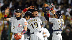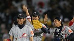 2008 북경올림픽야구 아시아 예선 한국과 일본의 경기가 2일 대만 인터콘티넨탈구장에서 벌어져 한국이 3-4로 역전패, 올림픽 직행 티켓의 자력 획득이 불가능해졌다. 호시노 감독 등 코칭스태프가 기뻐하며 포수 아베와 기쁨을 나누고 있다./타이중=손용호 기자spjj@osen.co.kr <2007 삼성 PAVV 프로야구> [Copyright ⓒ...