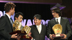 2007 프로야구 각 포지션별 최고의 선수를 가리는 '2007 골든글러브시상식'이 11일 프로야구 선수와 관계자들이 참석한 가운데 코엑스에서 열렸다. 김경문 두산 감독이 골든글러브를 수상한 소속팀 고영민 이종욱 리오스에게 축하 인사를 전하고 있다./손용호 기자spjj@osen.co.kr <2007 삼성 PAVV 프로야구>...