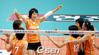'NH농협07-08 V리그' KT&G와 도로공사의 경기가 16일 오후 대전 충무실내체육관에서 벌어져 KT&G가 세트스코어 3-0으로 승리했다. KT&G 지정희의 스파이크가 블로킹에 막히고 있다. /대전=황세준 기자 storkjoon@osen.co.kr [Copyright ⓒ 한국 최고의 스포츠 엔터테인먼트 전문 미디어...