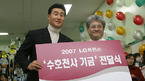 LG 트윈스가 서울대 어린이병원과 함께 진행하는 'LG트윈스 수호천사 기금' 전달 행사가 18일 낮 서울대 어린이병원에서 열렸다. 2007시즌 1년간 적립한 2000만 원 전달식과 박용택 이종렬 박명환 이승호가 참가한 가운데 사인회 및 즐거운 행사를 가졌다. 주장 이종렬이 김종성 서울대 어린이병원장에게 성금을 전달하고 있다./김영민...
