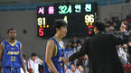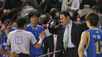 '2007-2008 SK텔레콤 T 프로농구' 인천 전자랜드와 서울 삼성 경기가 20일 오후 인천 삼산월드실내체육관에서 열렸다. 4쿼터 종료 32초을 남기고 삼성 안준호 감독이 심판 판정에 불만을 표시하며 선수들을 코트 밖으로 철수시키자 이상민이 타월을 두른 채 감독의 지시를 기다리고 있다./인천=김영민...