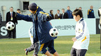 LA 갤럭시의 데이빗 베컴이 28일 서울 상암월드컵경기장 보조구장에서 많은 팬들이 지켜보는 가운데 공개 팀 훈련을 마친후 어린이들을 상대로 유소년축구클리닉을 가졌다. 베컴이 어린이들과 함께 공을 차고 있다./상암=손용호 기자spjj@osen.co.kr [Copyright ⓒ 한국 최고의 스포츠 엔터테인먼트 전문 미디어...