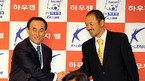 '삼성하우젠 K-리그2008'공식 기자회견이 14개 구단 감독과 선수대표가 참석한 가운데 3일 오전 서울 그랜드힐튼 호텔에서 열렸다. 감독 중 최연장자인 김정남(65, 울산 현대) 김호(64, 대전 시티즌) 감독이 새로 만든 우승 트로피를 들어보이고 있다./손용호 기자spjj@osen.co.kr [Copyright ⓒ 한국 최고의...