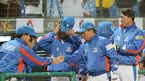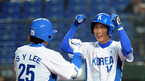 베이징 올림픽 야구 최종예선 호주와의 두번째 경기가 8일 저녁 7시30분(한국시간) 타이중 인터컨티넨탈 구장에서 열렸다. 한국이 16-2 7회 콜드게임승을 거둔 뒤 김동주 류현진이 동료들과 승리의 하이파이브를 나누고 있다./타이중=김영민 기자ajyoung@osen.co.kr [Copyright ⓒ 한국 최고의 스포츠 엔터테인먼트 전문 미디어...