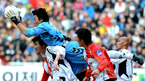 '삼성 하우젠 K리그 2008' 부산 홈 개막 경기 부산 아이파크와 전북 현대의 경기가 9일 부산 아시아드 주경기장에서 벌어졌다. 전반 전북 골키퍼 권순태가 조재진 위로 점프하며 공중볼을 잡아내고 있다. /부산=황세준 기자 storkjoon [Copyright ⓒ 한국 최고의 스포츠 엔터테인먼트 전문 미디어...