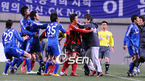 '삼성 하우젠컵 2008' 라이벌전인 수원 삼성과 FC 서울의 경기가 2일 상암 월드컵경기장에서 벌어져 서동현의 결승골과 조용태의 추가골에 힘입어 수원이 2-0으로 승리를 거뒀다. 후반 종료 직전 서울 이상협(가운데)과 수원 송종국(오른쪽)이 시비가 붙자 선수들이 말리고 있다. 둘 다 퇴장당했다. /상암=황세준 기자...