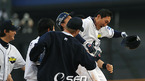 '2008 삼성 PAVV 프로야구' 두산 베어스와 SK 와이번스 경기가 19일 잠실구장에서 벌어졌다. 두산의 11회말 2사 만루서 대타 전상렬이 끝내기 안타를 친 뒤 동료들의 축하를 받고 있다./잠실=김영민 기자ajyoung@osen.co.kr [Copyright ⓒ 한국 최고의 스포츠 엔터테인먼트 전문 미디어...
