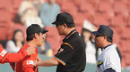 '2008 삼성 PAVV 프로야구' 두산 베어스와 SK 와이번스 경기가 19일 잠실구장에서 벌어졌다. 두산 7회말 1사 1루서 오재원의 내야땅볼 때 1루 대주자 김재호가 병살을 막기 위해 슬라이딩하다 SK 유격수 나주환의 무릎 부위 유니폼을 스파이크로 찢어 김성근 SK 감독이 나와 항의하고 들어갈 때 SK 이광길 코치와 두산 김김광수...