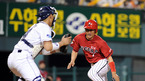'2008 삼성 PAVV 프로야구' 두산 베어스와 KIA 타이거즈의 경기가 1일 잠실야구장에서 벌어졌다. 5회초 2사 2루 차일목의 우전안타때 2루주자 이종범이 홈을 파고들었지만 두산 유재웅의 호송구로 아웃되고 있다./잠실=손용호 기자spjj@osen.co.kr [Copyright ⓒ 한국 최고의 스포츠 엔터테인먼트 전문 미디어...