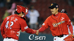 '2008 삼성 PAVV 프로야구' LG 트윈스와 SK 와이번스의 경기가 6일 잠실야구장에서 벌어져 SK가 물고 물리는 접전끝에 7-5로 승리했다. 경기를 마치고 SK 정상호 포수와 마무리 조웅천이 악수를 나누고 있다. /잠실=황세준 기자 storkjoon@osen.co.kr [Copyright ⓒ 한국 최고의 스포츠 엔터테인먼트...