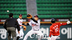 '2008 삼성 PAVV 프로야구' LG 트윈스와 SK 와이번스 경기가 8일 잠실구장에서 벌어졌다. LG 2회말 1사 1,2루 이종렬 내야땅볼시 1루 주자 안치용 2루에서 포스 아웃 병살 처리 되고 있다./잠실=김영민 기자ajyoung@osen.co.kr [Copyright ⓒ 한국 최고의 스포츠 엔터테인먼트 전문 미디어...