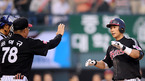 '2008 삼성 PAVV 프로야구' 두산 베어스와 LG 트윈스 경기가 7일 잠실구장 에서 벌어졌다. 8회초 2사 LG 박경수 좌월 역전 솔로 홈런을 날리고 홈인 3-2를 만들며 윤덕규 코치로 부터 환영을 받고 있다./잠실=김영민 기자ajyoung@osen.co.kr [Copyright ⓒ 한국 최고의 스포츠 엔터테인먼트 전문...