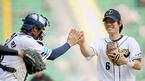 '2008 삼성 PAVV 프로야구' 두산 베어스와 LG 트윈스 경기가 7일 잠실구장 에서 벌어졌다. 3회초 2사 1,3루 두산 김재호 유격수가 LG 페타지니의 안타성 타구를 점프하며 아웃 처리 시킨뒤 공수 교대시 최승환 포수로 부터 축하를 받고 있다./잠실=김영민 기자ajyoung@osen.co.kr [Copyright ⓒ 한국...