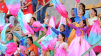 2010 남아프리카공화국 월드컵 3차예선 3조 5차전 한국-투르크메니스탄의 경기가 14일 투르크메니스탄 아슈하바트 올림픽스타디움에서 벌어져 한국이 김두현의 해트트릭에 힘입어 3-1로 승리를 거두었다. 공연을 위해 투르크메니스탄에 온 채향순 한국전통무용단 단원들이 경기장을 찾아 우아한 한복을 입고 응원하고 있다./아슈하바트=손용호...