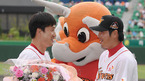 '2008 삼성 PAVV 프로야구' SK 와이번스와 한화 이글스 경기가 29일 인천문학구장에서 벌어졌다. 경기전 통산 1500경기에 출장한 SK 김재현에게 김원형이 축하 꽃다발을 전달하고 있다./인천=김영민 기자ajyoung@osen.co.kr [Copyright ⓒ 한국 최고의 스포츠 엔터테인먼트 전문 미디어...