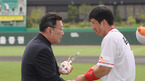 '2008 삼성 PAVV 프로야구' SK 와이번스와 한화 이글스 경기가 29일 인천문학구장에서 벌어졌다. 경기전 통산 1500경기에 출장한 SK 김재현에게 KBO 하일성 총장이 기념패를 전달하고 있다./인천=김영민 기자ajyoung@osen.co.kr [Copyright ⓒ 한국 최고의 스포츠 엔터테인먼트 전문 미디어...