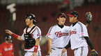'2008 삼성 PAVV 프로야구' LG 트윈스와 SK 와이번스 경기가 1일 잠실구장에서 벌어졌다. LG가 4-2 승리를 거두었다. 경기 종료후 선수들이 승리의 기쁨을 나누고 있다./잠실=김영민 기자ajyoung@osen.co.kr [Copyright ⓒ 한국 최고의 스포츠 엔터테인먼트 전문 미디어...