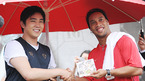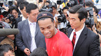 자신의 시그니쳐 축구화 ‘나이키 호나우디뉴 도이스 FG (Nike Ronaldinho Dois FG)’의 제품 출시 일정에 맞춰 7월 2일 한국을 찾은 호나우디뉴와 슈퍼주니어의 강인이 이 날 서울 여의도 한강고수부지에서 3대3 미니 축구 대결을 펼쳤다. 강인이 슈퍼주니어 해피의 사인CD를 호나우디뉴에게 전해준뒤 악수를 나누고 있다./민경훈 기자...