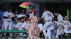 2008 삼성 PAVV 프로야구’우리 히어로즈와 롯데 자이언츠 경기가 8일 목동구장에서 벌어졌다.8회초 2사에 마운드에 올라 강민호를 삼진 처리한 다카쓰 투수를 턱톨이가 기모노 복장을 하고 덕아웃까지 에스코스트 하고 있다./목동=윤민호 기자 ymh@osen.co.kr [Copyright ⓒ 한국 최고의 스포츠 엔터테인먼트 전문 미디어...
