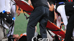 '2008 삼성 PAVV 프로야구' 우리 히어로스와 롯데 자이언츠의 경기가 9일 목동야구장에서 벌어졌다. 8회말 2사 1,2루 김일경의 우전안타때 홈을 파고들던 황재균이 롯데 포수 강민호와 충돌 강민호가 부상을 입어 병원으로 이송됐다. 들것이 들어와 강민호를 병원으로 이송하고 있다./목동=손용호 기자spjj@osen.co.kr...