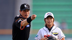 '2008 삼성 PAVV 프로야구' 두산 베어스와 SK 와이번스의 경기가 17일 잠실구장에서 벌어졌다. 지은희 美 LPGA 프로골프선수가 승리기원 시구를 하기 전에 강광회 구심에게 설명을 듣고 있다./잠실=민경훈 기자 rumi@osen.co.kr [Copyright ⓒ 한국 최고의 스포츠 엔터테인먼트 전문 미디어...