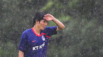 2008 베이징 올림픽 최종 엔트리에 선발된 태극전사들이 24일 파주 NFC에서 폭우에도 불구 성균대와 연습경기를 가졌다. 비가 많이 와 시야가 가리자 강민수가 손으로 비를 가리고 있다./파주=손용호 기자spjj@osen.co.kr [Copyright ⓒ 한국 최고의 스포츠 엔터테인먼트 전문 미디어 OSEN(www.osen.co.kr) 무단전재...