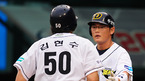 '2008 삼성 PAVV 프로야구' 두산 베어스와 롯데 자이언츠의 경기가 30일 잠실구장에서 벌어졌다. 1회말 1사 주자2,3루 두산 김동주가 우중간 2타점 적시타로 홈을 밟은 두산 이성열과 김현수가 하이파이브를 하려 하고 있다./잠실=민경훈 기자 rumi@osen.co.kr [Copyright ⓒ 한국 최고의 스포츠 엔터테인먼트...