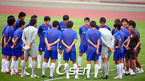 2008 베이징올림픽 D조 축구예선 첫 경기 카메룬과의 경기를 하루 앞둔 태극전사들이 6일 친황다오 동북대학교 훈련장에서 경기에 대비한 마지막 훈련을 가졌다. 훈련에 앞서 홍명보 코치가 선수들을 불러모아 정신무장을 시키고 있다./친황다오=올림픽 취재반 <니콘D3, 400미리, 감도800/셔터640.조리개f2.8 촬영> [Copyright ⓒ...