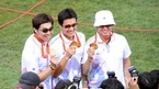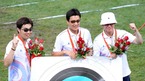 한국이 11일 베이징 올림픽 그린 양궁장에서 열린 양궁 남자 단체전에서 금메달을 획득했다. 시상식을 마친 박경모 주창환 임동현(앞부터)이 경기장을 빠져나가며 응원단에게 인사하고 있다./베이징=올림픽취재반 <니콘D3, 70-200미리, 감도800/셔터500,조리개f5.6,TX1.4배 컨버터촬영> [Copyright ⓒ 한국 최고의 스포츠 엔터테인먼트...