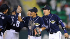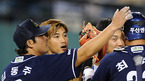 '2008 삼성 PAVV 프로야구' LG 트윈스와 두산 베어스의 경기가 30일 서울 잠실구장에서 벌어졌다. 이 날 경기에서 두산은 9회초에 터진 홍성흔의 1타점 결승 우전 안타에 힘입어 LG를 6-5로 꺾고 승리를 거뒀다. 경기를 마치고 세이브 투수가 된 두산 임태훈과 이종욱 김현수가 하이파이브를 하고 있다./잠실=민경훈 기자...