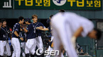 '2008 삼성 PAVV 프로야구' LG 트윈스와 두산 베어스의 경기가 30일 서울 잠실구장에서 벌어졌다. 7회말 2사 주자 1,2루 LG 김상현의 중전안타로 2루 주자 박용택이 홈으로 쇄도하였으나 실수로 홈을 밟지 않아 태그아웃된 후 자책하고 있다. 그리고 그 뒤에서 결정적인 실점위기를 넘긴 두산 선수들이 기뻐하고 있다./잠실=민경훈...