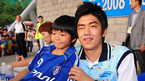 '삼성 하우젠 K-리그 2008' 수원 삼성과 부산 아이파크의 경기가 31일 수원월드컵경기장에서 벌어졌다. 경기에 앞서 베이징 올림픽 배드민턴 경기서 메달을 딴 이용대 이효정 이경원이 경기장을 방문 사인회를 가졌다. 이용대가 어린이 팬과 함께 사진을 찍다 윙크를 하고 있다./수원=손용호 기자spjj@osen.co.kr...
