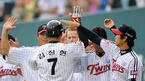 '2008 삼성 PAVV 프로야구' LG 트윈스와 두산 베어스의 경기가 31일 서울 잠실구장에서 벌어졌다. 3회말 1사 주자없는 상황에서 김상현이 우월솔로홈런을 날린 후 덕아웃에서 동료들과 기쁨을 나누고 있다./잠실=민경훈 기자 rumi@osen.co.kr [Copyright ⓒ 한국 최고의 스포츠 엔터테인먼트 전문 미디어...