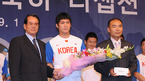 2008베이징올림픽 야구 금메달 축하 리셉션및 포상금 전달식이 1일 오전 장충동 신라호텔 다이너스티홀에서 열렸다. 포상금을 전달받은 김경문 감독 진갑용 선수단 주장이 신상우 총재와 함께 기념촬영을 하고 있다./김영민 기자ajyoung@osen.co.kr [Copyright ⓒ 한국 최고의 스포츠 엔터테인먼트 전문 미디어...