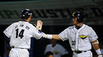 '2008 삼성 PAVV 프로야구' 두산 베어스와 한화 이글스의 경기가 2일 서울 잠실구장에서 벌어졌다. 3회말 1사 주자 1,3루 두산 김동주의 우중간 1타점 적시타로 3루 주자 고영민이 홈을 밟으며 홍성흔과 하이파이브를 하고 있다./잠실=민경훈 기자 rumi@osen.co.kr [Copyright ⓒ 한국 최고의 스포츠...