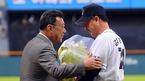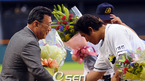 '2008 삼성 PAVV 프로야구' 두산 베어스와 한화 이글스의 경기가 2일 서울 잠실구장에서 벌어졌다. 경기 전 KBO 하일성 총장이 두산과 한화의 올림픽 대표팀 선수들 및 김광수 코치와 김경문 감독에게 꽃다발 전달을 했다. 하일성 총장이 김경문 감독에게 꽃다발을 전달하고 서로 미소짓고 있다./잠실=민경훈 기자...