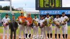 '2008 삼성 PAVV 프로야구' 두산 베어스와 한화 이글스의 경기가 2일 서울 잠실구장에서 벌어졌다. 경기 전 KBO 하일성 총장이 두산과 한화의 올림픽 대표팀 선수들 및 김광수 코치와 김경문 감독에게 꽃다발 전달식 행사를 마친후 관중들에게 인사를 하고 있다./잠실=민경훈 기자 rumi@osen.co.kr [Copyright...