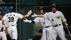 '2008 삼성 PAVV 프로야구' 두산 베어스와 한화 이글스의 경기가 2일 서울 잠실구장에서 벌어졌다. 1회말 1사 주자 3루 두산 김현수가 좌중간 1타점 적시타로 3루 주자 이종욱이 홈인 한후 김동주 홍성흔과 하이파이브를 하고 있다./잠실=민경훈 기자 rumi@osen.co.kr [Copyright ⓒ 한국 최고의 스포츠...