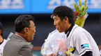'2008 삼성 PAVV 프로야구' 두산 베어스와 한화 이글스의 경기가 2일 서울 잠실구장에서 벌어졌다. 경기 전 KBO 하일성 총장이 두산과 한화의 올림픽 대표팀 선수들 및 김광수 코치와 김경문 감독에게 꽃다발 전달을 했다. 두산 김현수에게 하일성 총장에게 꽃다발을 받으며 쑥스럽게 웃고 있다./잠실=민경훈 기자...