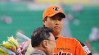 '2008 삼성 PAVV 프로야구' 두산 베어스와 한화 이글스의 경기가 2일 서울 잠실구장에서 벌어졌다. 경기 전 KBO 하일성 총장이 두산과 한화의 올림픽 대표팀 선수들 및 김광수 코치와 김경문 감독에게 꽃다발 전달을 했다. 한화 류현진이 하일성 총장에게 꽃다발을 받으며 자랑스러운 표정을 짓고 있다./잠실=민경훈 기자...