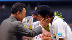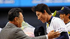 '2008 삼성 PAVV 프로야구' 두산 베어스와 한화 이글스의 경기가 2일 서울 잠실구장에서 벌어졌다. 경기 전 KBO 하일성 총장이 두산과 한화의 올림픽 대표팀 선수들 및 김광수 코치와 김경문 감독에게 꽃다발 전달을 했다. 하일성 총장이 두산 이종욱에게 꽃다발을 전달한 후 볼을 만지고 있다./잠실=민경훈 기자...