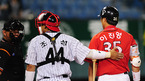 2008 삼성 PAVV 프로야구' LG 트윈스와 SK 와이번스의 경기가 5일 서울 잠실구장에서 벌어졌다. 8회초 무사 주자 없는 상황에서 SK 이진영이 타석에서 삼진아웃을 당하자 임채섭 구심에게 볼 판정에 대해 항의를 하고 있고 LG 조인성 포수가 옆에서 말리고 있다./잠실=민경훈 기자 rumi@osen.co.kr [Copyright...