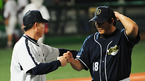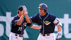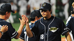 2008 삼성 PAVV 프로야구' 히어로즈와 두산 베어스의 경기가 6일 서울 목동구장에서 벌어졌다. 두산은 이날 경기에서 1회 선제 결승 만루홈런 포함 6타점을 작렬한 김동주와 7이닝 무실점으로 호투를 펼친 선발 이혜천의 활약에 힘입어 9-3으로 낙승을 거뒀다. 경기를 마치고 두산 김경문 감독과 최승환 포수가 하이파이브를 하고...